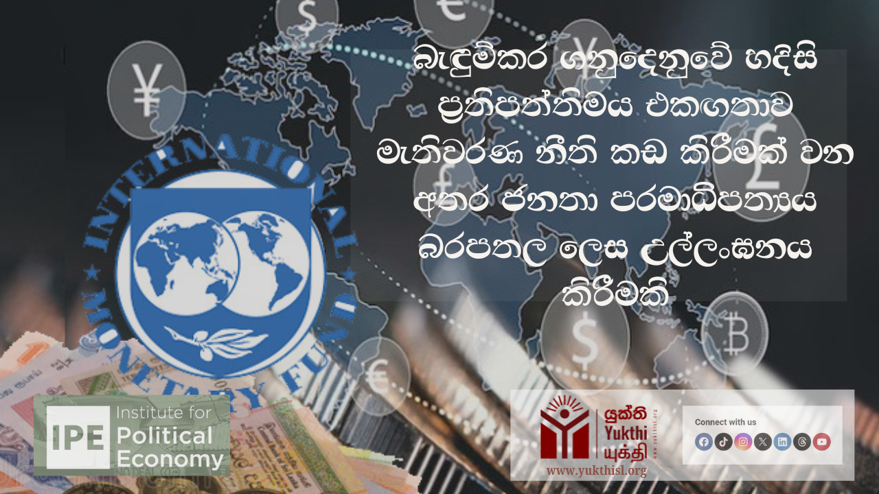 පුද්ගලික ණය හිමියන් සමඟ ණය ප්රතිව්යුහගත කිරීමේ හදිසි ප්රතිපත්තිමය එකඟතාව විසින් නිරූපනය කරන්නේ පවත්නා රජය විසින් තමන්ගේ පටු දේශපාලන අරමුණු වෙනුවෙන් ශ්රී ලංකා ජනතාවගේ ආර්ථික අපේක්ෂාවන් අනතුරේ හෙලා ඇති ආකාරය යි. දේශපාලන හෝ ආර්ථික බලය අතින් කවර මට්ටමක සිටියද, එකී සියලු රාජ්යයන්ගේ අභිවෘද්ධිය වෙනුවෙන් කටයුතු කිරීමේ එක්සත් ජාතීන්ගේ අධිකාරය හිමිකරගත් අන්තර්ජාතික මූල්ය අරමුදලේ නිහඊභඞතාව තුල නිරූපනය වන්නේ එහි ණය හිමියන්ගේ වුවමනාවන් වෙනුවෙන් පක්ෂපාතී වන ප්රජාතන්ත්රවිරෝධි හැසිරීමයි.